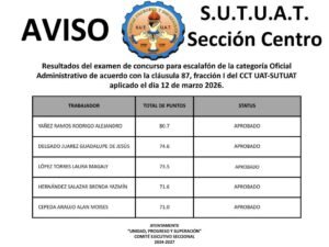 Abr 19 Información compartida del Sutuat sección centro 2024-2027 Resultados del examen de concurso para escalafón de la categoría Oficial Administrativo, aplicado el día 12 de marzo 2026 📝