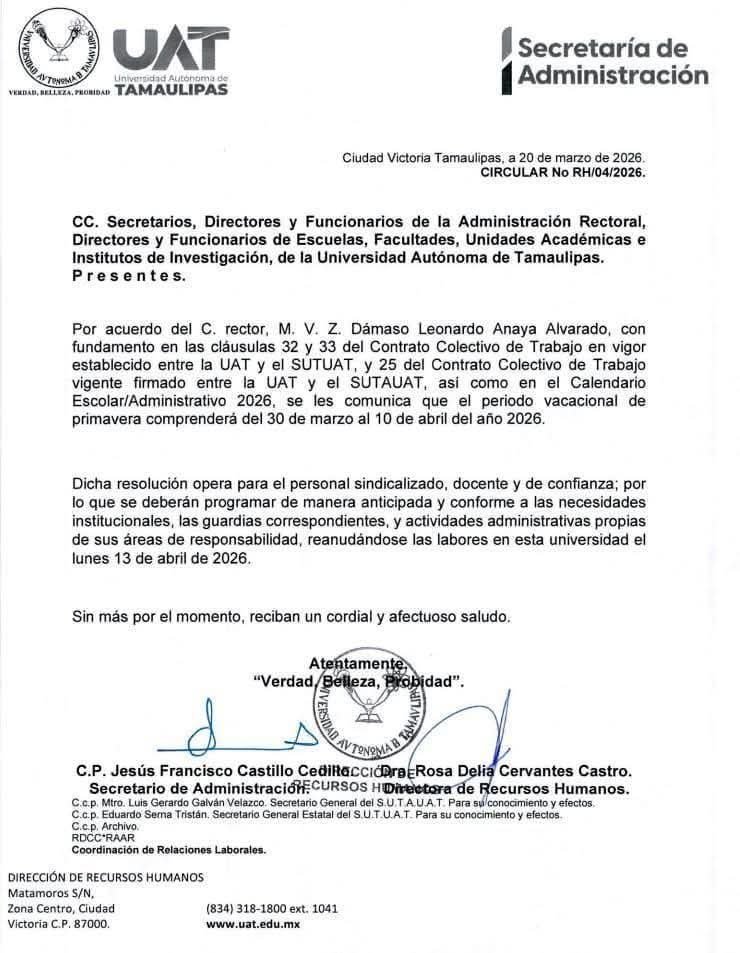 Circular informativa, conforme al calendario escolar vigente, el periodo vacacional de primavera comprenderá del lunes 30 de marzo al viernes 10 de abril del año 2026.
